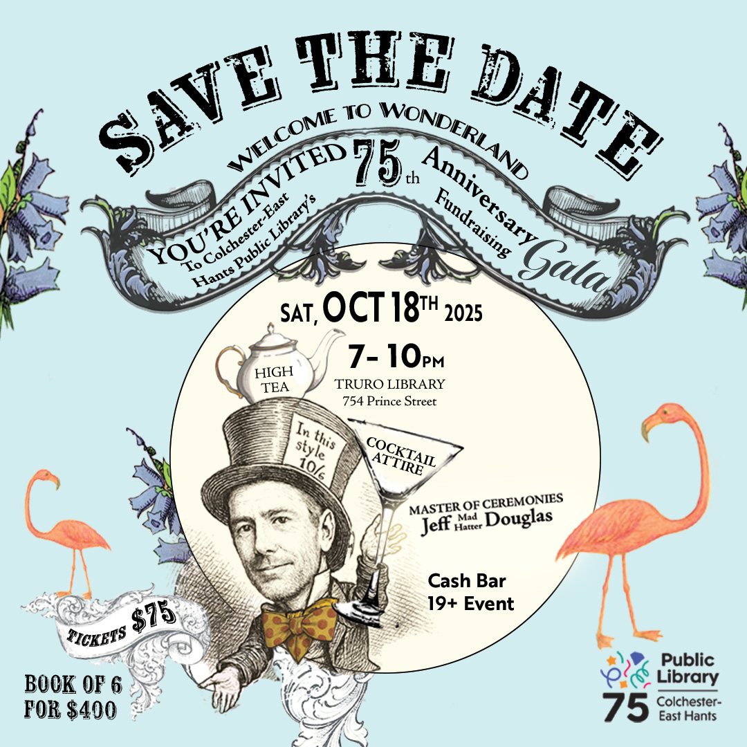 You're invited to our 75th Anniversary fund raising Gala. October 18, 2025, 7p.m. to 10p.m. Wonderland themed! Tickets are $75 each; book of 6 tickets for $400 Cash Bar - 19+ Event Please help us fundraise for a New Library Van! Tickets available for sale at all our library branches Also call 902-895-4183 to reserve […]
